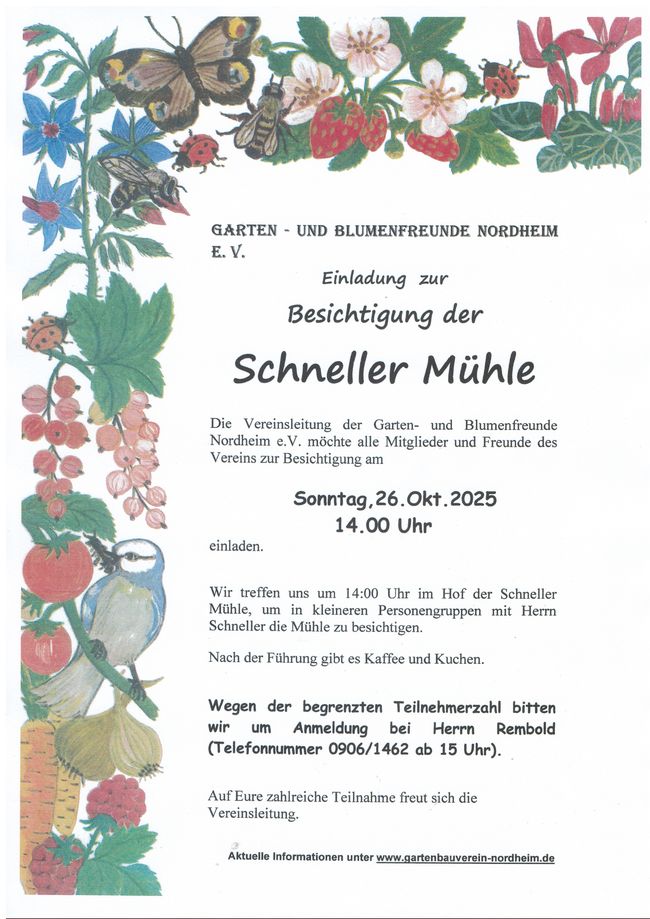 Am 26. Oktober besuchten die Garten- und Blumenfreunde Nordheim die ortsansässige Schnellermühle. Die zahlreichen Mitglieder erfuhren viel über das Mühlenwesen und die einzelnen Arbeitsabläufe. Bei Kaffee und Kuchen klang der interessante Nachmittag aus. |
