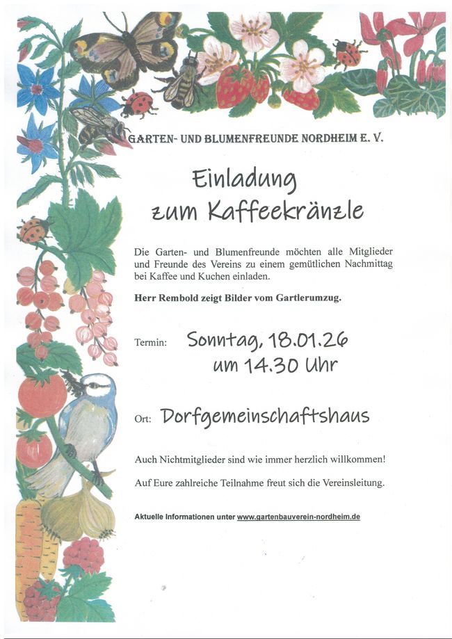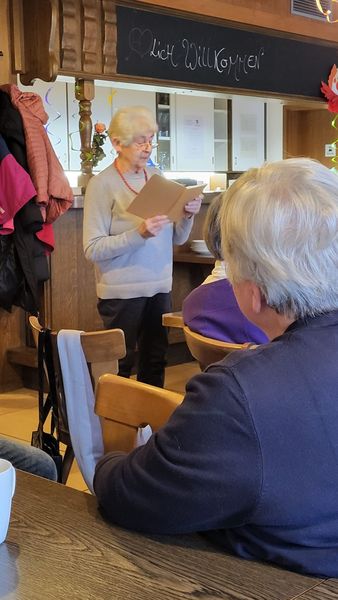 Nach der Begrüßung durch den Vereinsvorsitzenden Karl Rembold berichtete Sabrina Pfeifer in einer powerpoint-Präsentation von der Teilnahme der Garten- und Blumenfreunde am Reichsstraßenfest 2025. Das Kaffeekränzle im gewohnten und vertrauten Dorfgemeinschaftshaus war dieses Jahr sehr gut besucht. Anschließend trug die Ehrenvorsitzende Anni Häckel in gekonnter und bewährter Manier eine lustige und besinnliche Geschichte über "den Schutzengel" in schwäbischer Mundart vor. Bei herrlichem Kaffee und Kuchen klang der Nachmittag aus. Zum Abschluss durfte jede Besucherin noch eine Primel des Tischschmuckes mit nach Hause nehmen. |